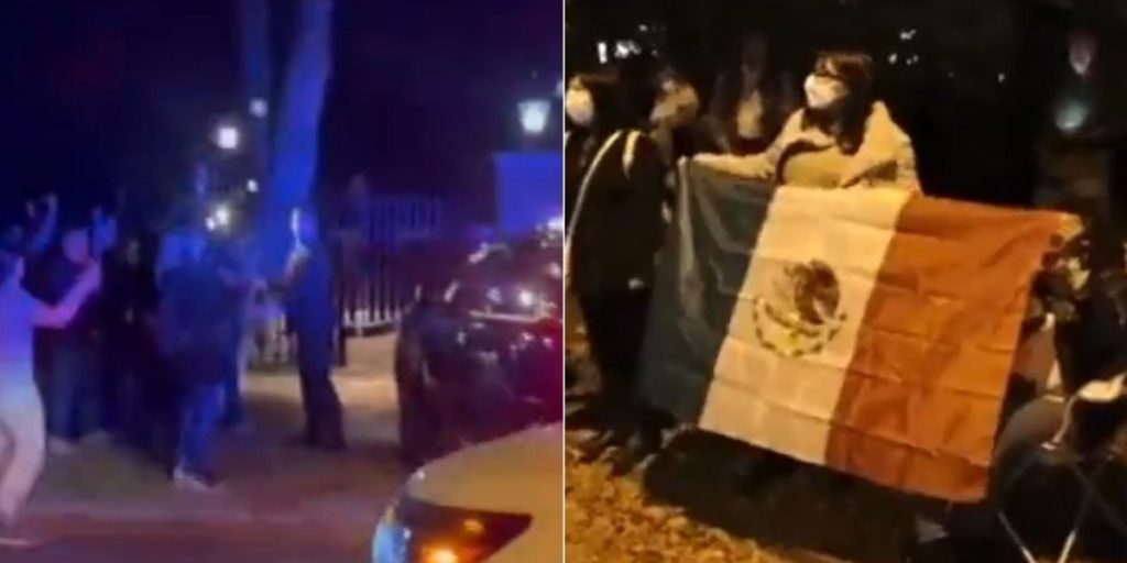 Con una bandera, sombreros y leyendas en apoyo al mandatario, esperaron en la acera para ver pasar el convoy presidencial. López Obrador viajó desde Cancún, Quintana Roo, a la capital de Estados Unidos en un vuelo de poco más de tres horas.
