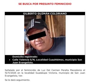 En la comunidad de Guadalupe Victoria, en San Juan Evangelista, se reporta el asesinato de la señora Luz del Carmen Peralta Macedonio, presuntamente a manos de su pareja sentimental, Gilberto Guzmán Coloriano.